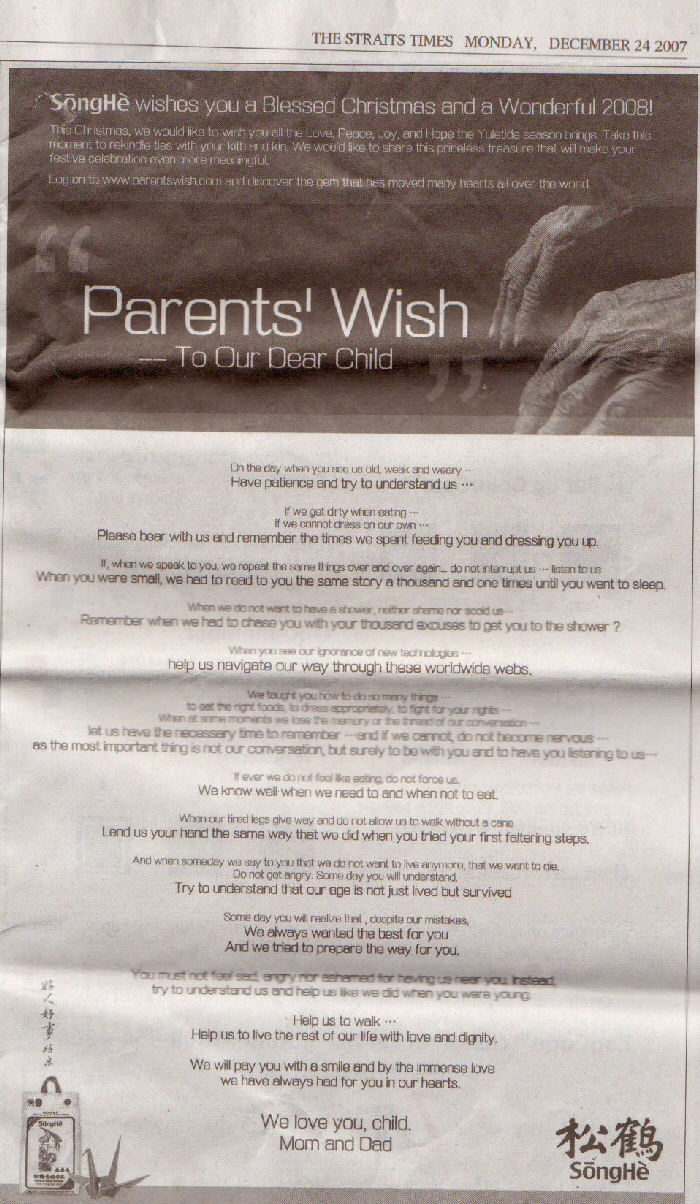Songhe Fragrant Rice of Singapore placed the advertisement below in page 3 of The Strait Times of Singapore on December 24, 2007 in honor of Songhe's mother.